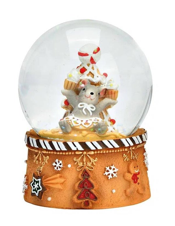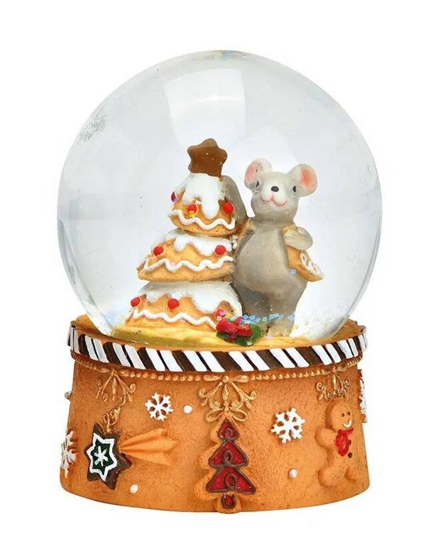 Haal de magie van de feestdagen in huis met deze schattige sneeuwbol! Deze feestelijke bol van glas (7x7x9 cm) toont een vrolijke kerstmuis, met keuze uit twee betoverende scènes: in de ene houdt de muis een kleurrijke kersttraktatie vast, terwijl hij in de andere naast een prachtig versierde kerstboom staat. De voet van de sneeuwbol is gedecoreerd als een peperkoekgebakje, compleet met gedetailleerde versieringen van peperkoekmannetjes, sneeuwvlokken en sterren. Deze charmante gingerbread sneeuwbol brengt een speelse en warme kerstsfeer in huis en is een perfecte aanvulling op je kerstdecoratie of als een uniek cadeautje voor de feestdagen!