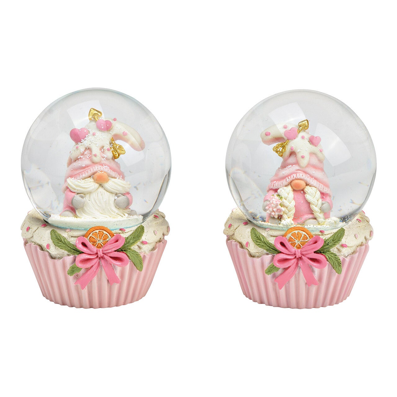 Mooie cupcake sneeuwbol in roze tinten met een kerstkabouter